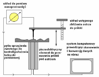 Schemat budowy skaningowego mikroskopu tunelowego (STM).